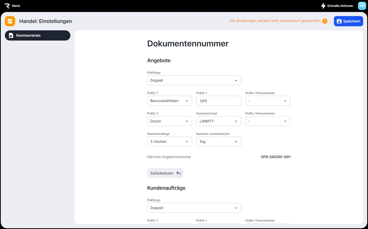 In den Einstellungen Nummernkreis kannst du das Nummernformat für Angebote, Kundenaufträge und Retouren festlegen.