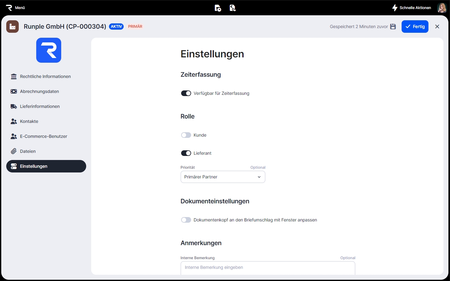 Du kannst eine interne Bemerkung zu Ihrem Geschäftspartner hinzufügen.