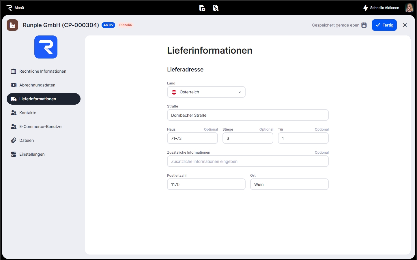 Hier kannst du die Lieferadresse angeben, die standardmäßig in Angeboten, Kundenaufträgen oder Lieferscheinen verwendet wird.
