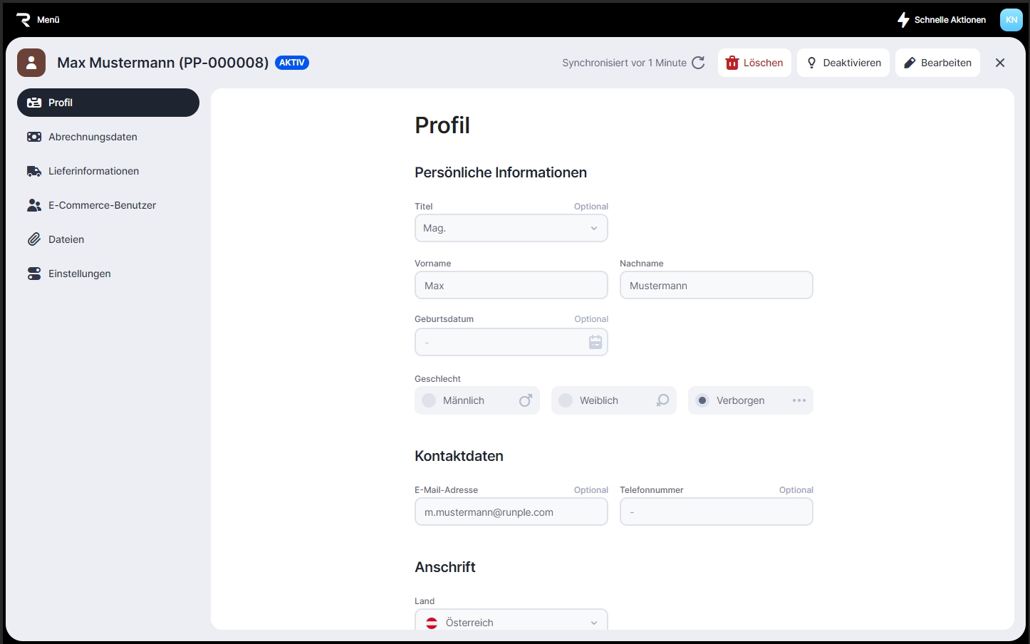 Hier findest du Informationen über den Geschäftspartner und die Einstellungen.