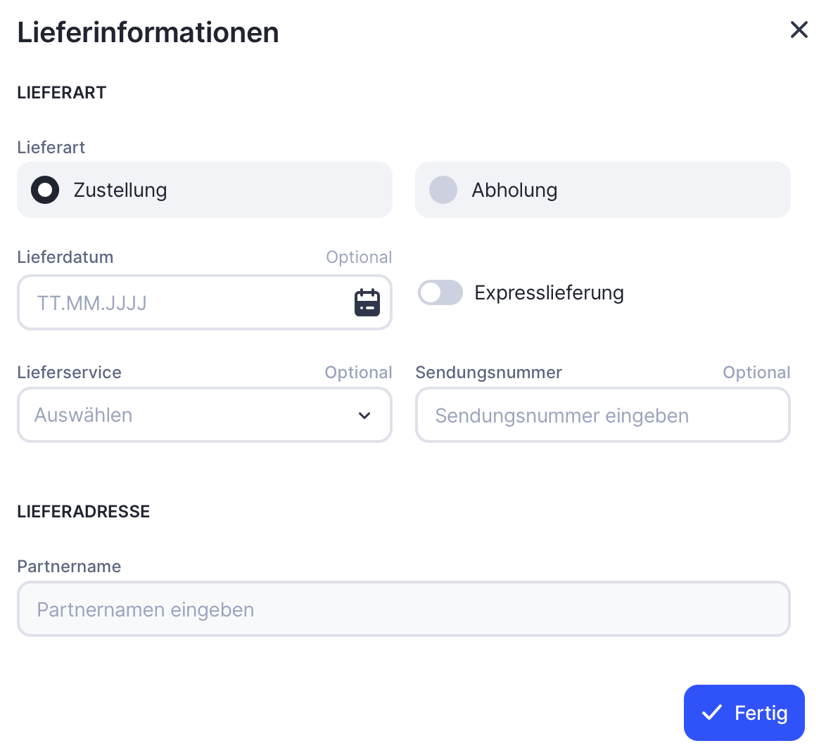 Wenn du die Lieferart wählst, kannst du das voraussichtliche Lieferdatum, die Adresse und die Kosten angeben.