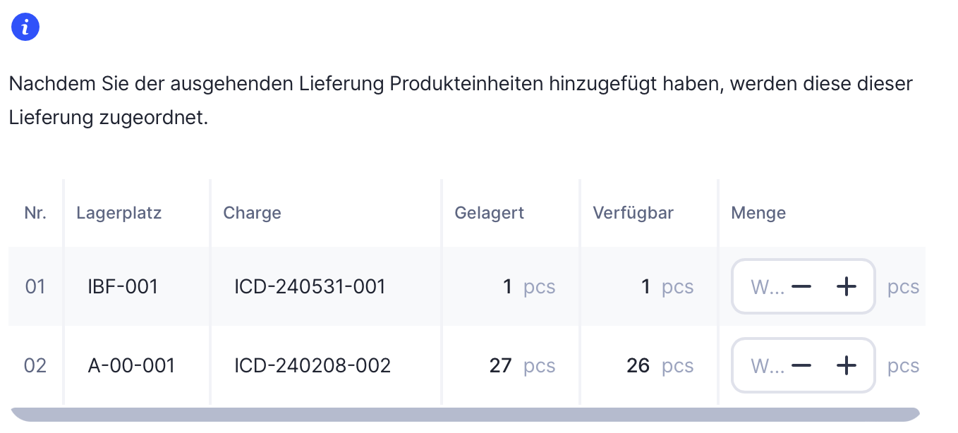 Nachdem die ausgehende Lieferung erstellt wurde, werden bestimmte Produkteinheiten für sie reserviert. Die Menge und die Lagerplätze für reservierte Einheiten werden in der Packliste angezeigt.