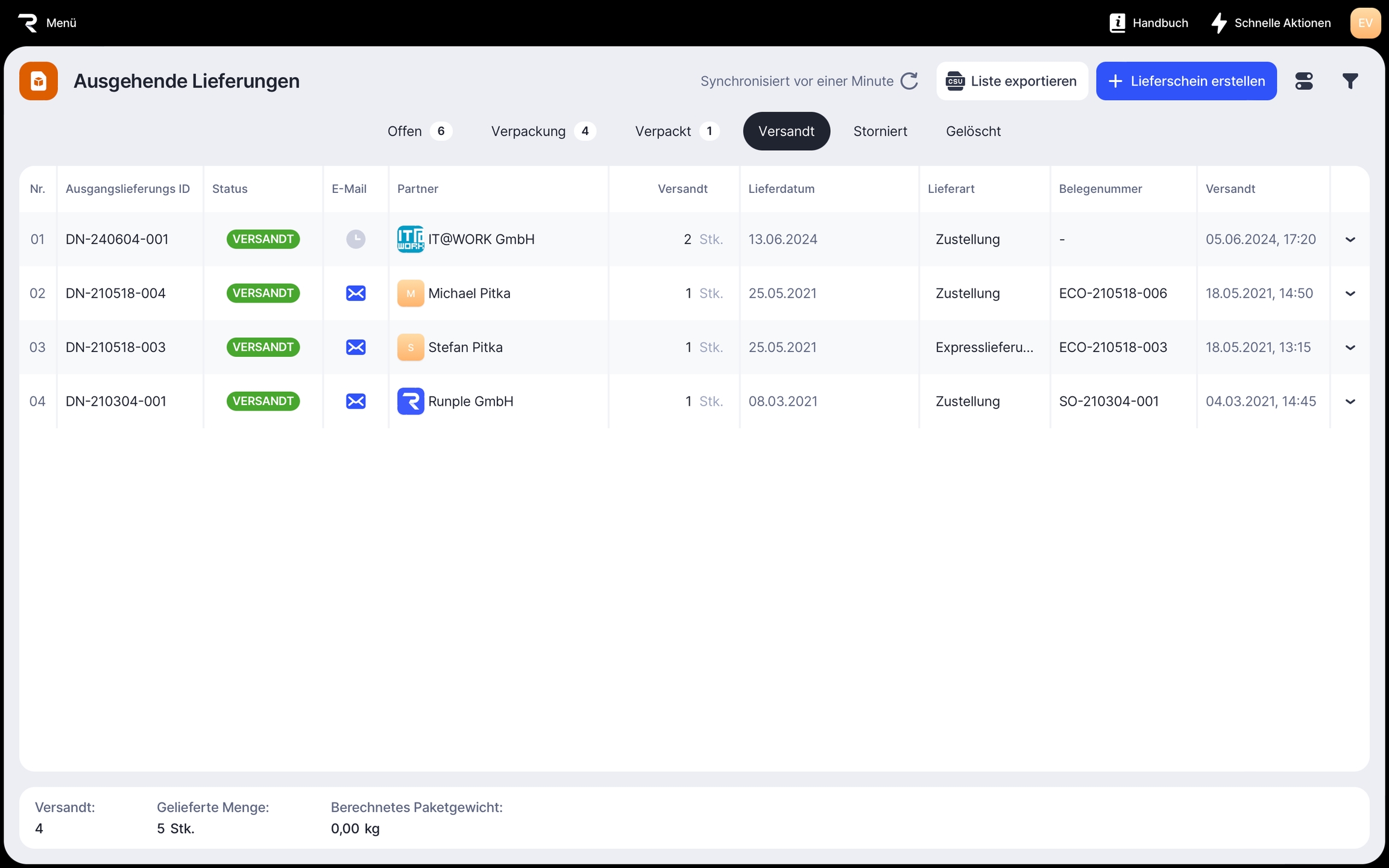 Danach wird die zurückgesendete ausgehende Lieferung in der Liste der verpackten Lieferungen angezeigt.
