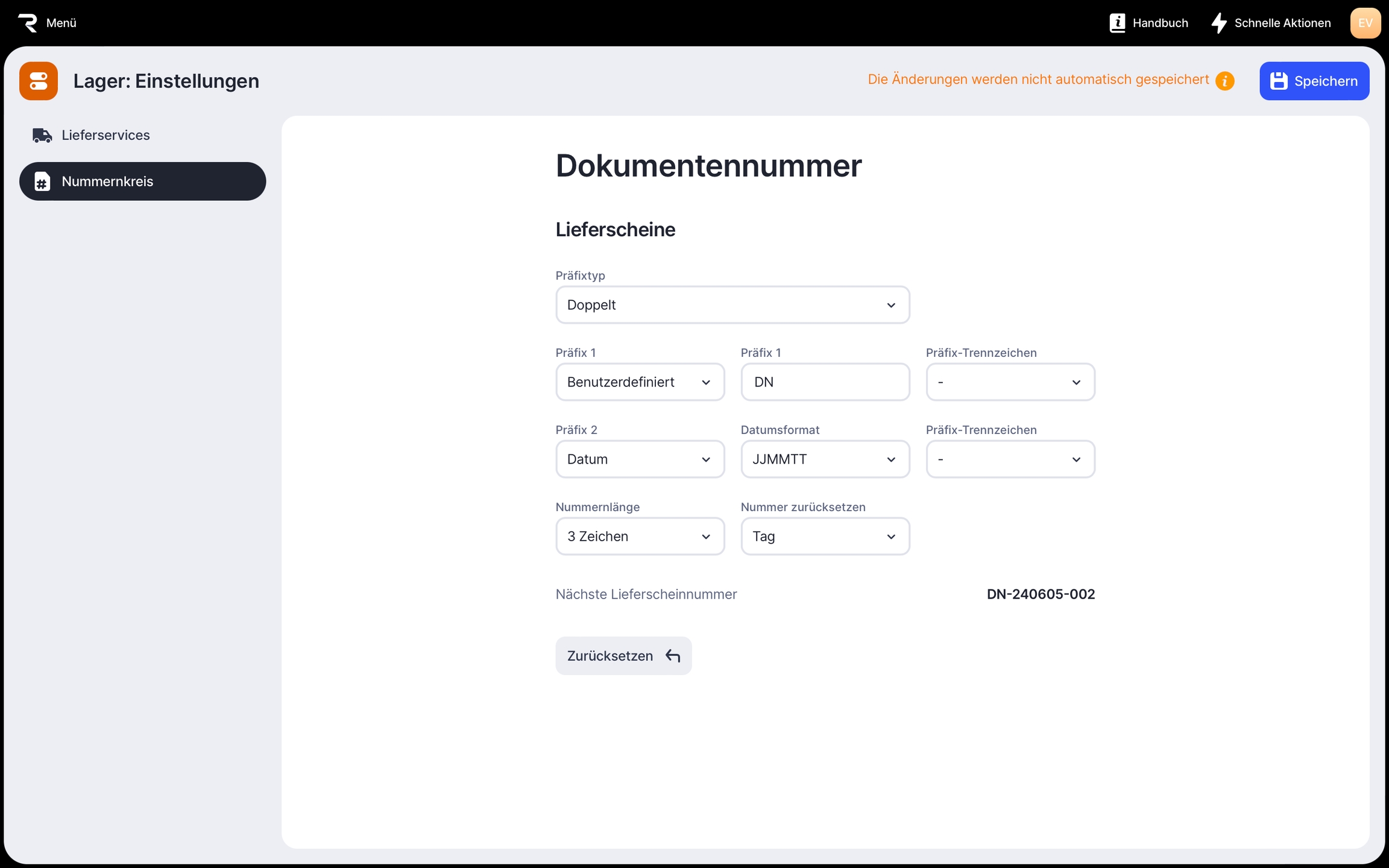 In den Einstellungen Dokumentennummer kannst du das Nummernformat für Lieferscheine festlegen.