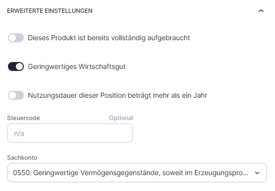 Das neue Sachkonto wird automatisch in den Eingangsrechnungen für Artikel verwendet, die für die interne Verwendung gekauft werden.