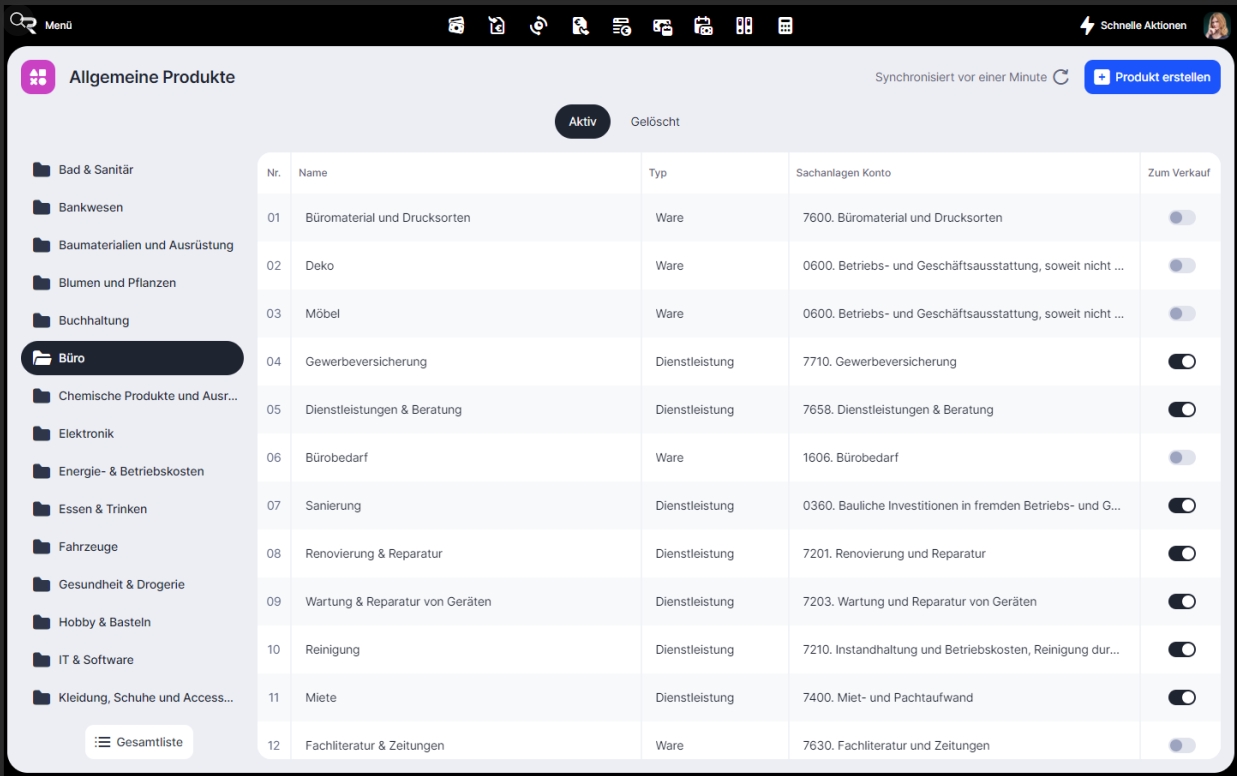 In Runple werden die Sachkonten automatisch auf Grund der in den Produktdetails angegebenen Produktart definiert.