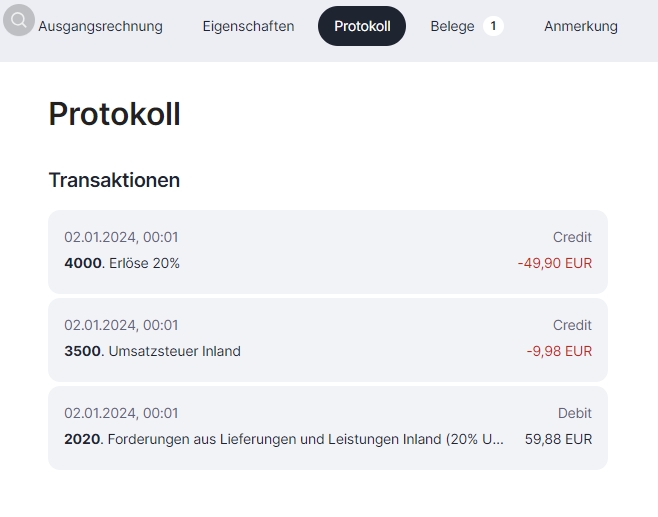 Sachkonto-Transaktionen werden automatisch erstellt, wenn du eine Rechnung, eine Gutschrift oder eine Zahlung erstellst, bearbeitest oder stornierst.